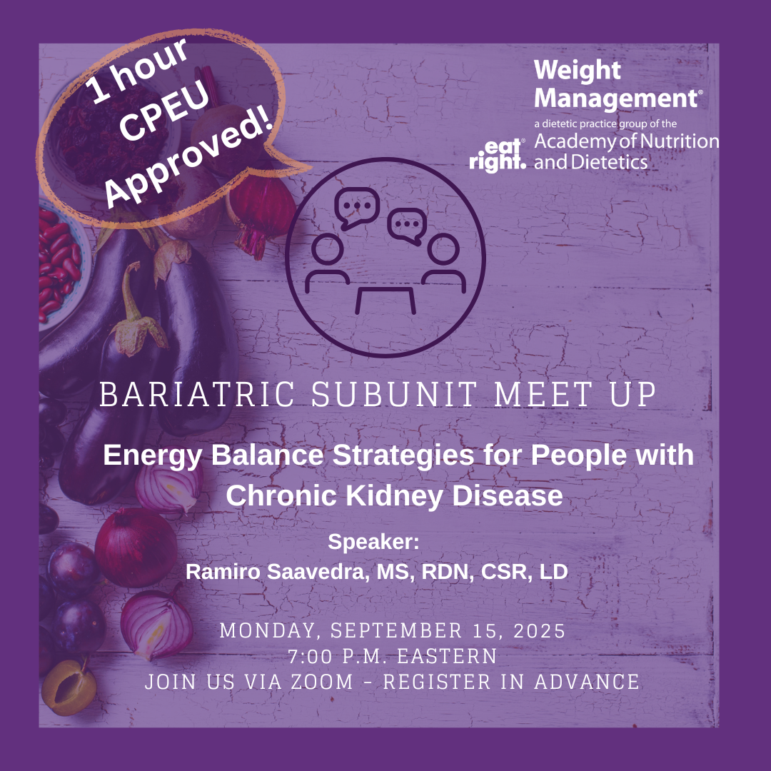 During this session, we will review the options of energy balance and weight maintenance as they relate to people with Chronic Kidney Disease. We will discuss the pros and cons of each modality of treatment. The topic of bariatric surgery as a bridge to transplant will be highlighted. RDNs will be able to integrate this into their care of renal patients looking for weight loss options.